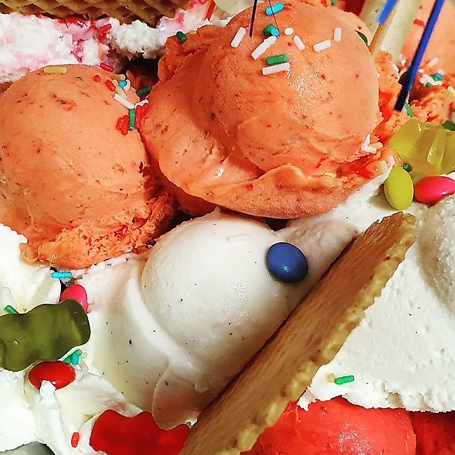 MuckibecherVanille- und Himbeereis, Erdbeersoße, Smarties und Lolli